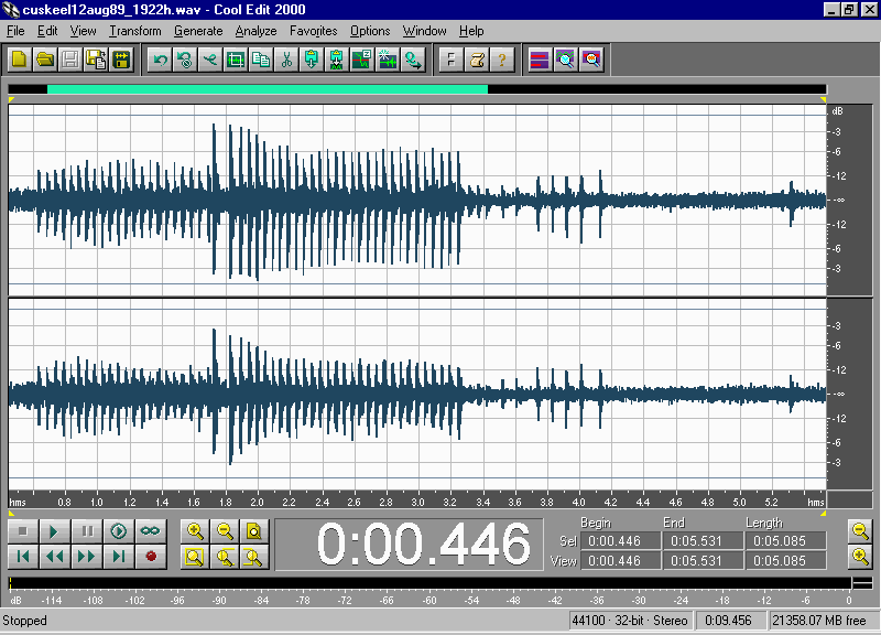 Fig. 6 ). A sequence recorded simultaneously with spawning by the largest female and male individuals is shown in Figure 6 (see also sound clip cuskeel12aug_1922h.wav). Calling and spawning ceased after 13 September in the laboratory. Field recordings made with an underwater hydrophone during August and September 2000 and attributed to striped cusk-eels (Fig. 7 see also sound clip cuskeel5aug00.wav) exhibited a similar daily and seasonal pattern. Calls were rare after mid-September and occurred from sunset until approximately 3 hours after sunset. Other data suggests that striped cusk-eels may be abundant as far north as Narragansett Bay, Rhode Island (Perkins, in press), and perhaps Cape Cod, MA (pers. observ.). If verified, that would extend the species range and demonstrate the usefulness of passive acoustics in monitoring some fish populations.