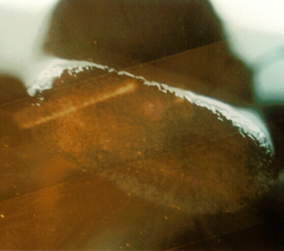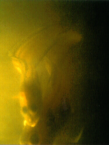 Fig. 2 ). The tank water was maintained under ambient temperature and salinity via a flow-through sea water system. The fish were fed live grass shrimp, Palaemonetes vulgaris, each night. Observations of spawning behavior were made each night beginning just prior to sunset and ending about three hours after sunset. A red light placed above the tank and small flashlights were used to illuminate the fish for observations. The red light appeared to have no influence on the fish behavior, while the flashlights occasionally startled the fish if moved abruptly. Cusk-eels normally remained burrowed under the substrate during the day and did not emerge until sunset or later. Emergence was usually a gradual process, taking up to many minutes time (Fig. 3 ). Calling was typically initiated at sunset while the fish were still burrowed and continued throughout emergence and spawning until about 2 hours after sunset. Courtship and spawning occurred soon after sunset. Courtship was most often initiated by the male, but was also initiated by the female. Often courtship was initiated while one sex was still partially burrowed. Typically a male would approach a burrowed female and nudge her with his mouth and barbel-like pelvic fins until she emerged from the sand (sometimes the female nudged a burrowed male out of the sand). Once spawning was initiated, the male would grasp the female by the nape (between the eyes and dorsal fin origin) with its head placed at right angles to the female's body, and his body bent sharply backward to allow the male to swim alongside the female (Figure 4 ), also view the real movie "cusk1spawn.rm"). The male would often "mouth" the female vigorously during this stage, while the female would swim rapidly around the tank as if to dislodge the male. Occasionally two rival males would attempt to mate with a single female. They would vigorously push and shove each other in an attempt to dislodge their rival and retain their own hold on the female. After a moment of vigorous twisting and rapid swimming, the pair would rise to the surface where the male often twisted around to accomplish a brief ventral mount. The male would then rapidly flip away while the female often remained at the surface gulping air. This sequence can be viewed in the accompanying movie clip. Note that the gelatinous egg mass can be seen protruding from the female's vent after the male flips away. The egg mass is positively buoyant and superficially resembles a ctenophore in the water (Fig. 5 , and video clip cusk1egg.rm). Its size appears to be a function of the size of the female. The egg mass dissipates within 24 hours. Larvae hatched within 48 hours and survived until about 64 hours before apparently dying of starvation. The largest female began spawning almost nightly (>40 times) beginning on 30 July through 13 September. The second largest female began spawning 3 August and also spawned almost nightly through 13 September (21 times), while the smallest female began spawning 12 August and stopped after 6 September (12 times).Sounds produced by cusk-eels during spawning in the laboratory were recorded in air with a tape recorder (