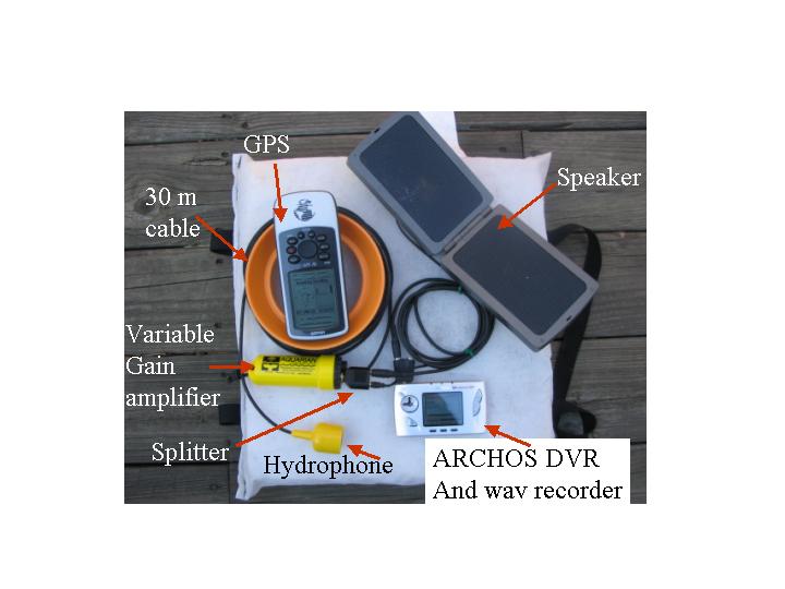 A simple survey of sounds can be carried out with some basic equipment (Fig. 1 and 2). Basically you need a hydrophone and a recorder of some type. Even a low quality, non-calibrated hydrophone can be useful in many circumstances. Especially during the initial exploratory phase, or when surveying temporal and low-resolution spatial characteristics of well known sounds. Many different types of recorders can be used, ranging from digital recorders to conventional desktop tape recorders. Regardless of the recording device used, investigators should be aware of the recorder's limitations. Many devices designed for human speech cut off the lower frequencies (below 120 Hz) that are often important biologically. Many digital devices now only record files to mp3 format which is compressed, and results in the loss of important acoustic data. Devices that record to wav format are preferred. It also helps to have a way to monitor sounds during recording to verify that the equipment is working properly. Headphones are useful in noisy areas, while amplified speakers are useful when more than one person is monitoring the sounds, or when the investigator does not wish to be encumbered by earphones. Monitoring sounds in real time allows one to make visual observations that may aid in sound identification. Although in some cases variable gain amplifiers for the hydrophone are useful, in most cases it is better to have a simple preamplifier to ensure standardized sampling.