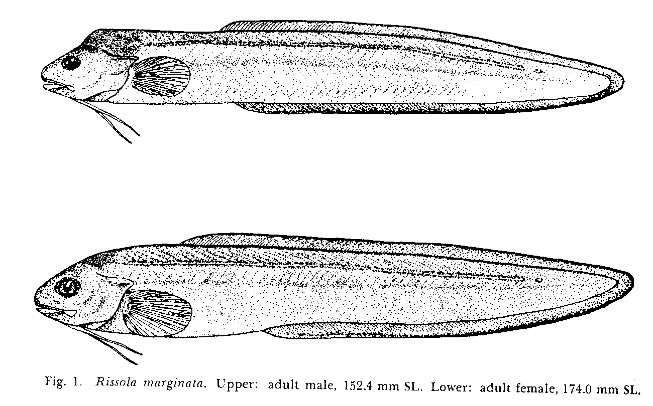 Figure 1. Male and female striped cusk-eels (taken from Courtenay, W.R. 1971. Sexual dimorphism of the sound producing mechanism of the striped cusk-eel, Rissola marginata (Pisces: Ophidiidae). Copeia 1971:259-268).